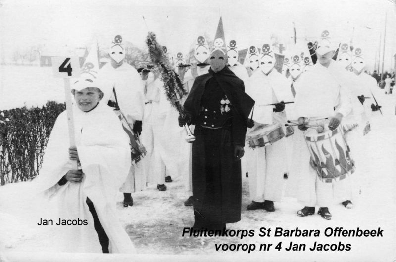 Het trommel- en fluiterkorps St. Barbara trekt verkleed mee met de carnavalsoptocht. Op kop met nummer 4 Jan Jacobs.