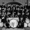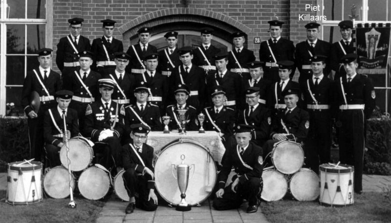 Groepsfoto van het trommel- en fluiterkorps St. Barbara uit 1962.