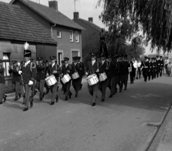 Het trommel- en fluiterkorps St. Barbara trekt samen met de schutterij door Offenbeek.