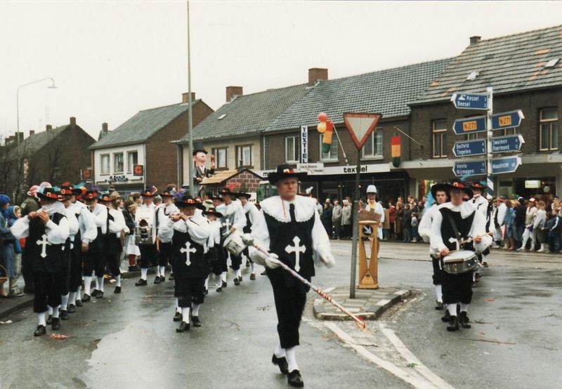 Het trommel- en fluiterkorps St. Barbara trekt mee met de carnavalsoptocht in 1987 met tambour-maître Harrie v d Velden