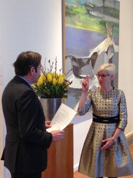 Een bijzonder moment in Maastricht. Gouverneur Theo Bovens neemt de eed af van Petra Dassen - Housen als start voor haar tweede ambtstermijn als burgemeester van de gemeente Beesel.