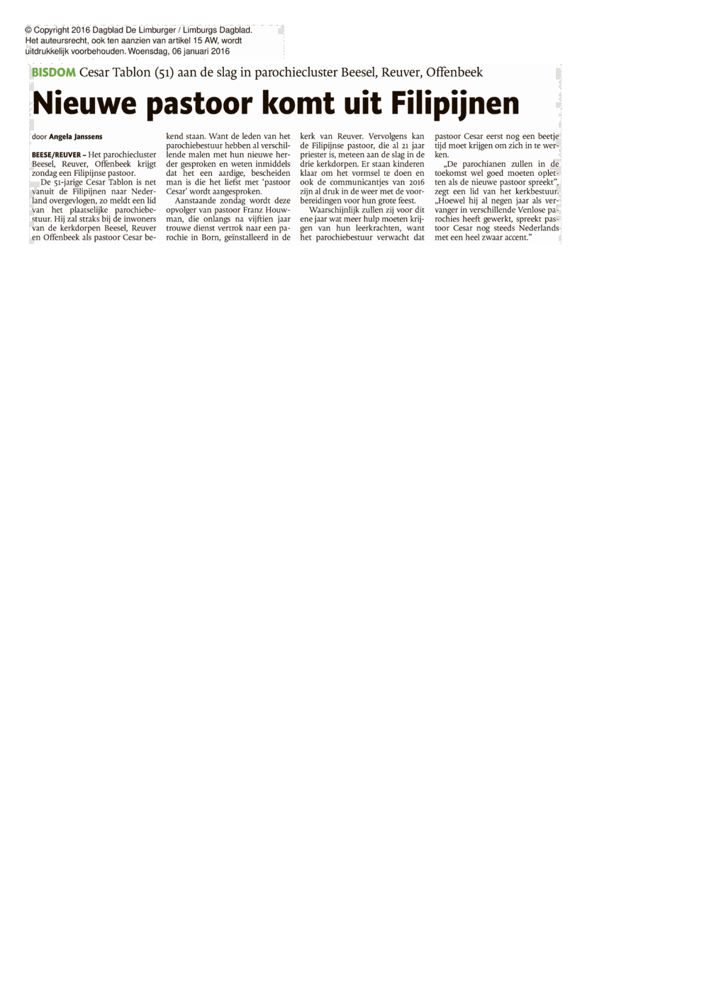 Cesar Tablon, de nieuwe pastoor in Reuver, komt uit de Filipijnen.