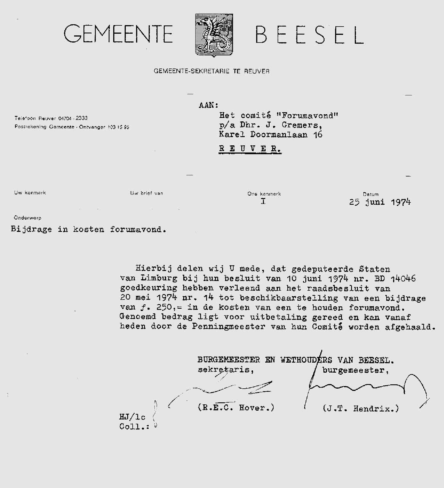 Brief gemeente Beesel waarin een bijdrage wordt toegekend in de kosten van een FORUM-avond ter gelegenheid van de gemeenteraadsverkiezingen van 1974 georganiseerd door de Jongerenvereniging..