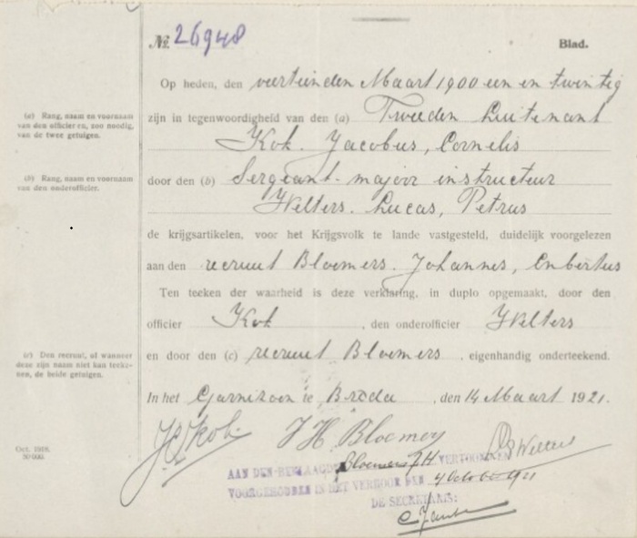 Bewijs van voorlezing van de Krijgsartikelen aan J.H. Bloemers.