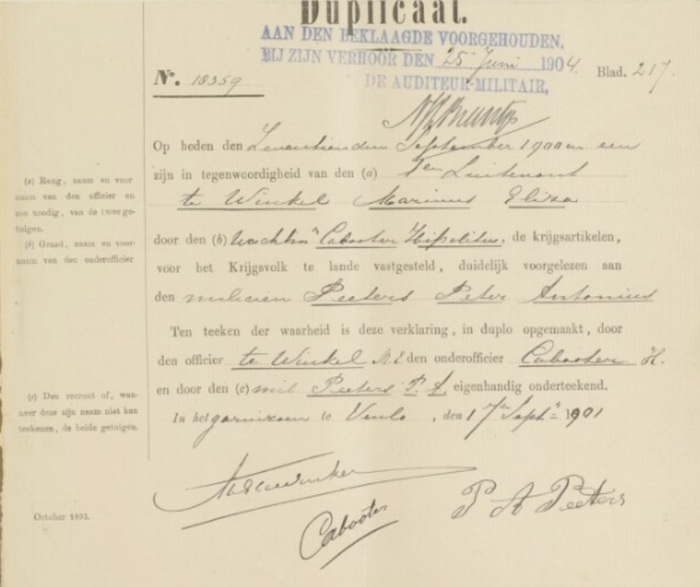 Bewijs van voorlezing van de Krijgsartikelen aan P.A. Peeters.
